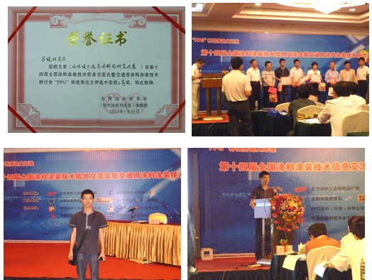 2011年5月25-26日在西安皇后大酒店舉辦的“PPG杯”第十四屆全國涂料涂裝技術(shù)信息交流會暨交通用涂料涂裝技術(shù)研討會上,由我公司馬曉陽博士主講的“水性快干汽車涂料的研究進(jìn)展”榮獲專業(yè)論文三等獎。